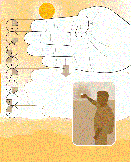 Всегда полезно знать и уметь определить, когда солнце зайдет за линию горизонта и наступят сумерки. Не важно, на отдыхе вы или в походе, эти знания всегда могут пригодиться чтобы правильно распределить свое время. Для того чтобы определить сколько времени осталось до заката, вам понадобятся всего лишь пальцы руки. Итак, приступим. Вытяните руку так, чтобы солнце как бы ложилось на ваш указательный палец.Теперь считаем количество пальцев до горизонта. При более-менее средней толщине пальцев, каждый палец соответствует приблизительно пятнадцати минутам до заката. Если же ваши пальцы не совсем стандартного размера, советуем вам провести опыт: посчитать время которое необходимо солнцу чтобы опуститься в низ, и далее, исходя из этого показателя вы всегда сможете измерить время и примерно знать когда начнет темнеть. Таким образом, если посчитать количество пальцев от положения солнца до линии горизонта и умножив их на 15 минут, вы узнаете время когда солнце будет в закате.